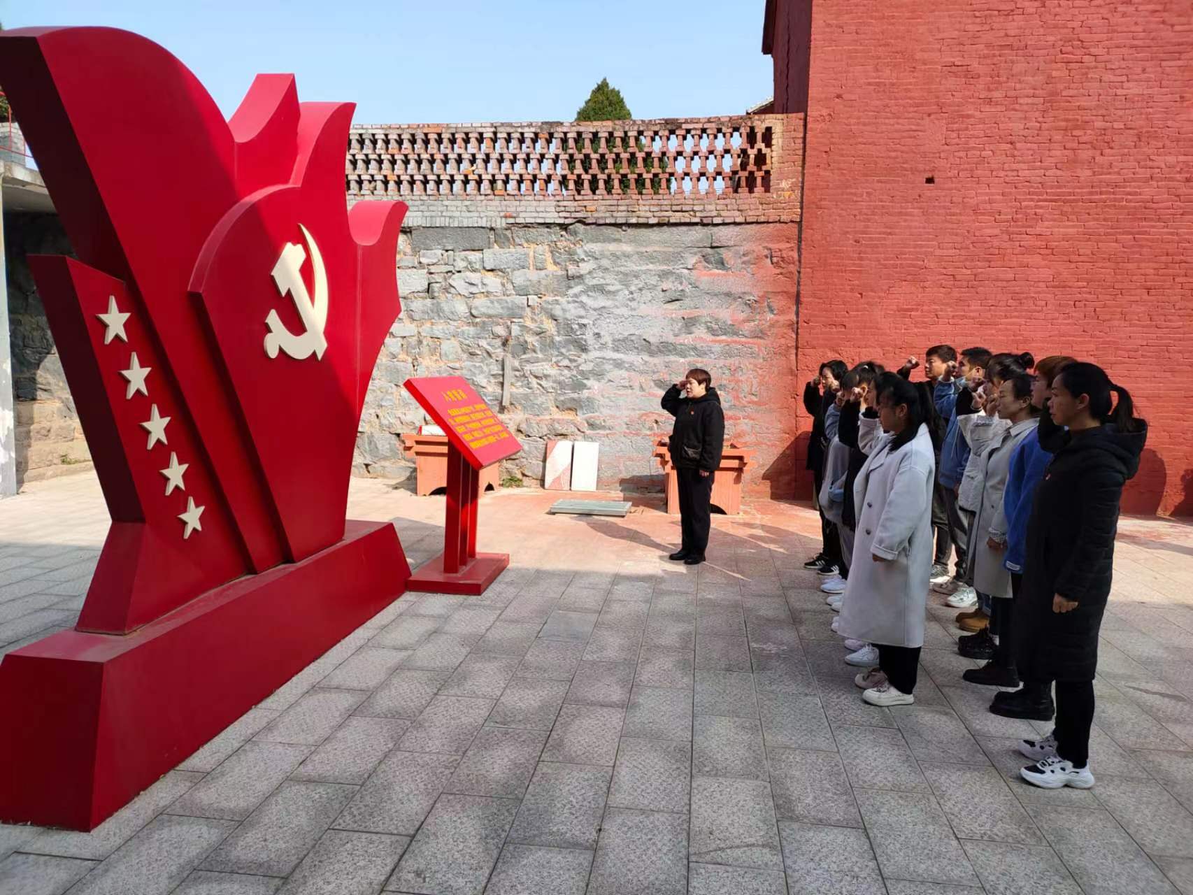 參觀了展覽后,大家站在鮮紅的黨旗雕塑前,莊嚴地舉起右拳,重溫了入黨誓詞。一聲聲鏗鏘有力的誓言,回響在大院內(nèi),表達了大家對黨無限忠誠,熱愛黨,永遠跟黨走的堅定決心。